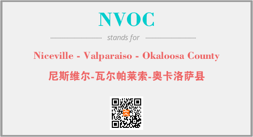 上述内容是“Niceville - Valparaiso - Okaloosa County”作为“NVOC”的缩写,解释为“尼斯维尔-瓦尔帕莱索-奥卡洛萨县”时的信息,以及英文缩略词NVOC所代表的英文单词,其对应的中文拼音、详细解释以及在英文中的流行度和相关分类、应用领域及应用示例等。