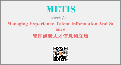 上述内容是“Managing Experience Talent Information And Stance”作为“METIS”的缩写,解释为“管理经验人才信息和立场”时的信息,以及英文缩略词METIS所代表的英文单词,其对应的中文拼音、详细解释以及在英文中的流行度和相关分类、应用领域及应用示例等。