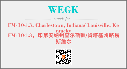 上述内容是“FM-104.3, Charlestown, Indiana/ Louisville, Kentucky”作为“WEGK”的缩写,解释为“FM-104.3,印第安纳州查尔斯顿/肯塔基州路易斯维尔”时的信息,以及英文缩略词WEGK所代表的英文单词,其对应的中文拼音、详细解释以及在英文中的流行度和相关分类、应用领域及应用示例等。