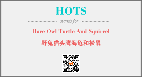 上述内容是“Hare Owl Turtle And Squirrel”作为“HOTS”的缩写,解释为“野兔猫头鹰海龟和松鼠”时的信息,以及英文缩略词HOTS所代表的英文单词,其对应的中文拼音、详细解释以及在英文中的流行度和相关分类、应用领域及应用示例等。