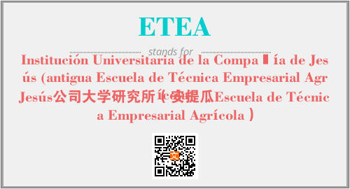 英文缩略词“ETEA”经常作为“Institución Universitaria de la Compañía de Jesús (antigua Escuela de Técnica Empresarial Agrícola)”的英文缩写来使用,中文表示:“Jesús公司大学研究所(安提瓜Escuela de Técnica Empresarial Agrícola)”。本文将详细介绍英文缩写词ETEA所代表英文单词,其对应的中文拼音、详细解释以及在英语中的流行度。此外,还有关于缩略词ETEA的分类、应用领域及相关应用示例等。
