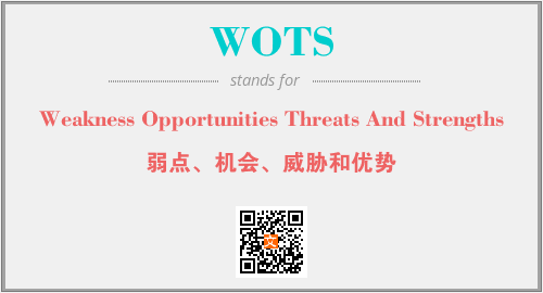 上述内容是“Weakness Opportunities Threats And Strengths”作为“WOTS”的缩写,解释为“弱点、机会、威胁和优势”时的信息,以及英文缩略词WOTS所代表的英文单词,其对应的中文拼音、详细解释以及在英文中的流行度和相关分类、应用领域及应用示例等。