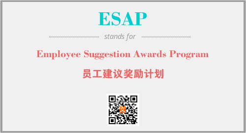 上述内容是“Employee Suggestion Awards Program”作为“ESAP”的缩写,解释为“员工建议奖励计划”时的信息,以及英文缩略词ESAP所代表的英文单词,其对应的中文拼音、详细解释以及在英文中的流行度和相关分类、应用领域及应用示例等。