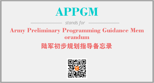 上述内容是“Army Preliminary Programming Guidance Memorandum”作为“APPGM”的缩写,解释为“陆军初步规划指导备忘录”时的信息,以及英文缩略词APPGM所代表的英文单词,其对应的中文拼音、详细解释以及在英文中的流行度和相关分类、应用领域及应用示例等。
