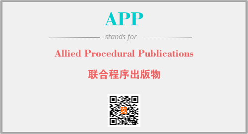 上述内容是“Allied Procedural Publications”作为“APP”的缩写,解释为“联合程序出版物”时的信息,以及英文缩略词APP所代表的英文单词,其对应的中文拼音、详细解释以及在英文中的流行度和相关分类、应用领域及应用示例等。