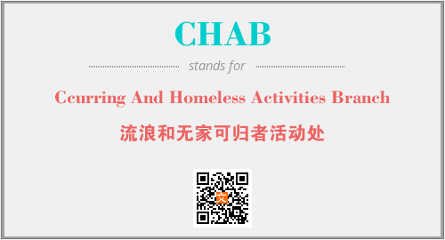 上述内容是“Ccurring And Homeless Activities Branch”作为“CHAB”的缩写,解释为“流浪和无家可归者活动处”时的信息,以及英文缩略词CHAB所代表的英文单词,其对应的中文拼音、详细解释以及在英文中的流行度和相关分类、应用领域及应用示例等。