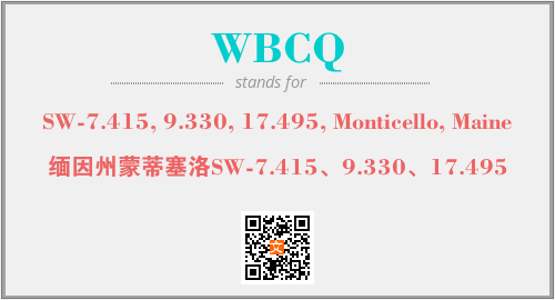 英文缩略词“WBCQ”经常作为“SW-7.415, 9.330, 17.495, Monticello, Maine”的英文缩写来使用,中文表示:“缅因州蒙蒂塞洛SW-7.415、9.330、17.495”。本文将详细介绍英文缩写词WBCQ所代表英文单词,其对应的中文拼音、详细解释以及在英语中的流行度。此外,还有关于缩略词WBCQ的分类、应用领域及相关应用示例等。