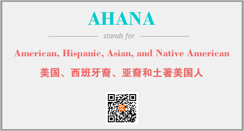 上述内容是“American, Hispanic, Asian, and Native American”作为“AHANA”的缩写,解释为“美国、西班牙裔、亚裔和土著美国人”时的信息,以及英文缩略词AHANA所代表的英文单词,其对应的中文拼音、详细解释以及在英文中的流行度和相关分类、应用领域及应用示例等。