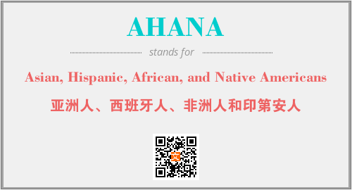 上述内容是“Asian, Hispanic, African, and Native Americans”作为“AHANA”的缩写,解释为“亚洲人、西班牙人、非洲人和印第安人”时的信息,以及英文缩略词AHANA所代表的英文单词,其对应的中文拼音、详细解释以及在英文中的流行度和相关分类、应用领域及应用示例等。