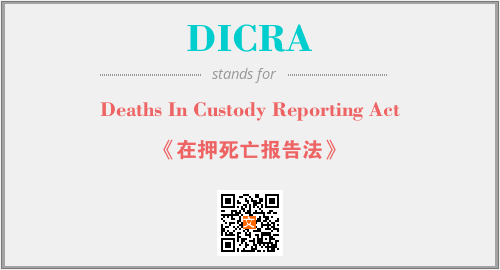 上述内容是“Deaths In Custody Reporting Act”作为“DICRA”的缩写,解释为“《在押死亡报告法》”时的信息,以及英文缩略词DICRA所代表的英文单词,其对应的中文拼音、详细解释以及在英文中的流行度和相关分类、应用领域及应用示例等。