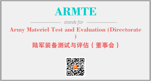 英文缩略词“ARMTE”经常作为“Army Materiel Test and Evaluation (Directorate)”的英文缩写来使用,中文表示:“陆军装备测试与评估(董事会)”。本文将详细介绍英文缩写词ARMTE所代表英文单词,其对应的中文拼音、详细解释以及在英语中的流行度。此外,还有关于缩略词ARMTE的分类、应用领域及相关应用示例等。