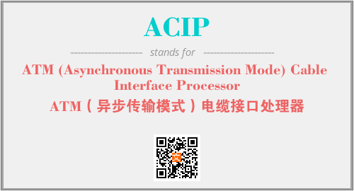 上述内容是“ATM (Asynchronous Transmission Mode) Cable Interface Processor”作为“ACIP”的缩写,解释为“ATM(异步传输模式)电缆接口处理器”时的信息,以及英文缩略词ACIP所代表的英文单词,其对应的中文拼音、详细解释以及在英文中的流行度和相关分类、应用领域及应用示例等。