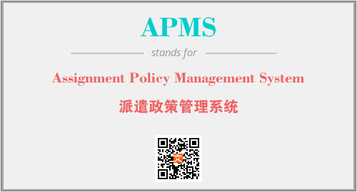 英文缩略词“APMS”经常作为“Assignment Policy Management System”的英文缩写来使用,中文表示:“派遣政策管理系统”。本文将详细介绍英文缩写词APMS所代表英文单词,其对应的中文拼音、详细解释以及在英语中的流行度。此外,还有关于缩略词APMS的分类、应用领域及相关应用示例等。