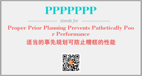 以上为Proper Prior Planning Prevents Pathetically Poor Performance英文缩略词PPPPPPP的中文解释,以及该英文缩写在英语的流行度、分类和应用领域方面的信息。