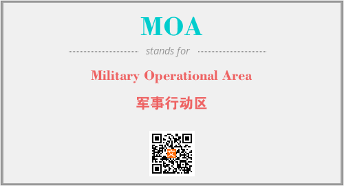 上述内容是“Military Operational Area”作为“MOA”的缩写,解释为“军事行动区”时的信息,以及英文缩略词MOA所代表的英文单词,其对应的中文拼音、详细解释以及在英文中的流行度和相关分类、应用领域及应用示例等。