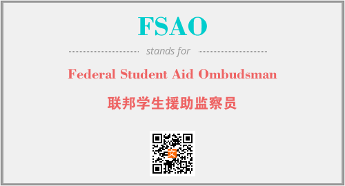上述内容是“Federal Student Aid Ombudsman”作为“FSAO”的缩写,解释为“联邦学生援助监察员”时的信息,以及英文缩略词FSAO所代表的英文单词,其对应的中文拼音、详细解释以及在英文中的流行度和相关分类、应用领域及应用示例等。