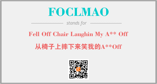 上述内容是“Fell Off Chair Laughin My A** Off”作为“FOCLMAO”的缩写,解释为“从椅子上摔下来笑我的A**Off”时的信息,以及英文缩略词FOCLMAO所代表的英文单词,其对应的中文拼音、详细解释以及在英文中的流行度和相关分类、应用领域及应用示例等。