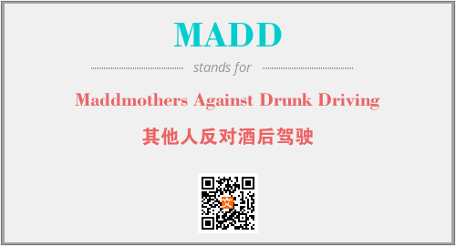 英文缩略词“MADD”经常作为“Maddmothers Against Drunk Driving”的英文缩写来使用,中文表示:“其他人反对酒后驾驶”。本文将详细介绍英文缩写词MADD所代表英文单词,其对应的中文拼音、详细解释以及在英语中的流行度。此外,还有关于缩略词MADD的分类、应用领域及相关应用示例等。