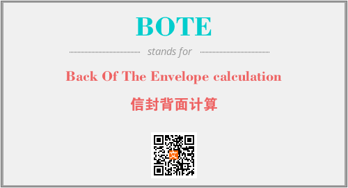 英文缩略词“BOTE”经常作为“Back Of The Envelope calculation”的英文缩写来使用,中文表示:“信封背面计算”。本文将详细介绍英文缩写词BOTE所代表英文单词,其对应的中文拼音、详细解释以及在英语中的流行度。此外,还有关于缩略词BOTE的分类、应用领域及相关应用示例等。