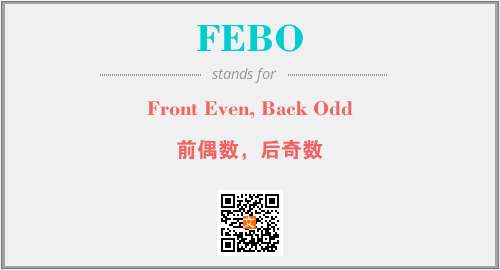 上述内容是“Front Even, Back Odd”作为“FEBO”的缩写,解释为“前偶数,后奇数”时的信息,以及英文缩略词FEBO所代表的英文单词,其对应的中文拼音、详细解释以及在英文中的流行度和相关分类、应用领域及应用示例等。