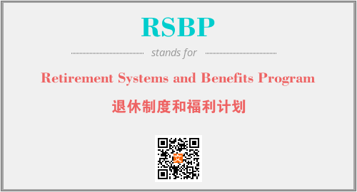 上述内容是“Retirement Systems and Benefits Program”作为“RSBP”的缩写,解释为“退休制度和福利计划”时的信息,以及英文缩略词RSBP所代表的英文单词,其对应的中文拼音、详细解释以及在英文中的流行度和相关分类、应用领域及应用示例等。