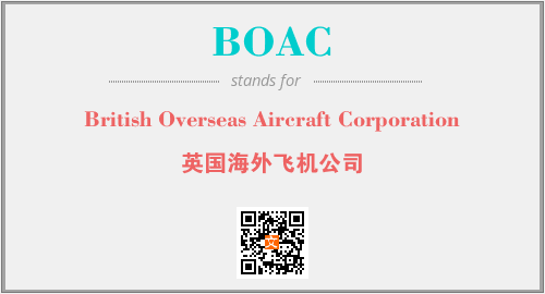 英文缩略词“BOAC”经常作为“British Overseas Aircraft Corporation”的英文缩写来使用,中文表示:“英国海外飞机公司”。本文将详细介绍英文缩写词BOAC所代表英文单词,其对应的中文拼音、详细解释以及在英语中的流行度。此外,还有关于缩略词BOAC的分类、应用领域及相关应用示例等。