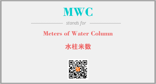 上述内容是“Meters of Water Column”作为“MWC”的缩写,解释为“水柱米数”时的信息,以及英文缩略词MWC所代表的英文单词,其对应的中文拼音、详细解释以及在英文中的流行度和相关分类、应用领域及应用示例等。