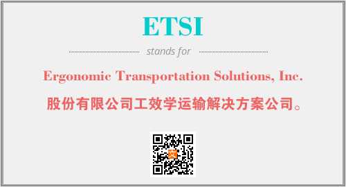 上述内容是“Ergonomic Transportation Solutions, Inc.”作为“ETSI”的缩写,解释为“股份有限公司工效学运输解决方案公司。”时的信息,以及英文缩略词ETSI所代表的英文单词,其对应的中文拼音、详细解释以及在英文中的流行度和相关分类、应用领域及应用示例等。