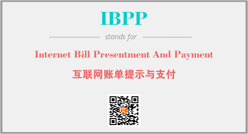 英文缩略词“IBPP”经常作为“Internet Bill Presentment And Payment”的英文缩写来使用,中文表示:“互联网账单提示与支付”。本文将详细介绍英文缩写词IBPP所代表英文单词,其对应的中文拼音、详细解释以及在英语中的流行度。此外,还有关于缩略词IBPP的分类、应用领域及相关应用示例等。