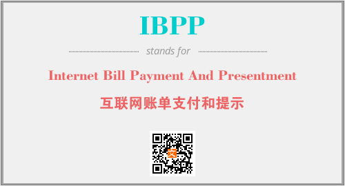 英文缩略词“IBPP”经常作为“Internet Bill Payment And Presentment”的英文缩写来使用,中文表示:“互联网账单支付和提示”。本文将详细介绍英文缩写词IBPP所代表英文单词,其对应的中文拼音、详细解释以及在英语中的流行度。此外,还有关于缩略词IBPP的分类、应用领域及相关应用示例等。
