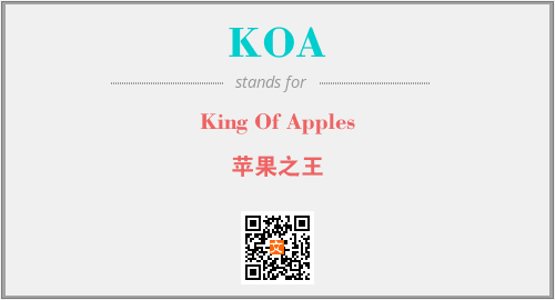 上述内容是“King Of Apples”作为“KOA”的缩写,解释为“苹果之王”时的信息,以及英文缩略词KOA所代表的英文单词,其对应的中文拼音、详细解释以及在英文中的流行度和相关分类、应用领域及应用示例等。