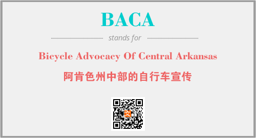 上述内容是“Bicycle Advocacy Of Central Arkansas”作为“BACA”的缩写,解释为“阿肯色州中部的自行车宣传”时的信息,以及英文缩略词BACA所代表的英文单词,其对应的中文拼音、详细解释以及在英文中的流行度和相关分类、应用领域及应用示例等。