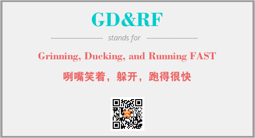 上述内容是“Grinning, Ducking, and Running FAST”作为“GD&RF”的缩写,解释为“咧嘴笑着,躲开,跑得很快”时的信息,以及英文缩略词GD&RF所代表的英文单词,其对应的中文拼音、详细解释以及在英文中的流行度和相关分类、应用领域及应用示例等。