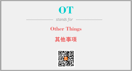 英文缩略词“OT”经常作为“Other Things”的英文缩写来使用,中文表示:“其他事项”。本文将详细介绍英文缩写词OT所代表英文单词,其对应的中文拼音、详细解释以及在英语中的流行度。此外,还有关于缩略词OT的分类、应用领域及相关应用示例等。