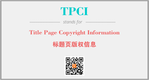 上述内容是“Title Page Copyright Information”作为“TPCI”的缩写,解释为“标题页版权信息”时的信息,以及英文缩略词TPCI所代表的英文单词,其对应的中文拼音、详细解释以及在英文中的流行度和相关分类、应用领域及应用示例等。