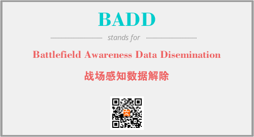 上述内容是“Battlefield Awareness Data Disemination”作为“BADD”的缩写,解释为“战场感知数据解除”时的信息,以及英文缩略词BADD所代表的英文单词,其对应的中文拼音、详细解释以及在英文中的流行度和相关分类、应用领域及应用示例等。