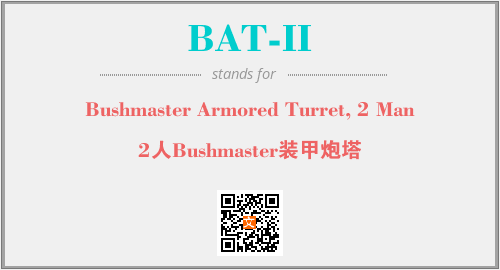 英文缩略词“BAT-II”经常作为“Bushmaster Armored Turret, 2 Man”的英文缩写来使用,中文表示:“2人Bushmaster装甲炮塔”。本文将详细介绍英文缩写词BAT-II所代表英文单词,其对应的中文拼音、详细解释以及在英语中的流行度。此外,还有关于缩略词BAT-II的分类、应用领域及相关应用示例等。