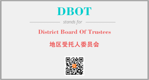 英文缩略词“DBOT”经常作为“District Board Of Trustees”的英文缩写来使用,中文表示:“地区受托人委员会”。本文将详细介绍英文缩写词DBOT所代表英文单词,其对应的中文拼音、详细解释以及在英语中的流行度。此外,还有关于缩略词DBOT的分类、应用领域及相关应用示例等。