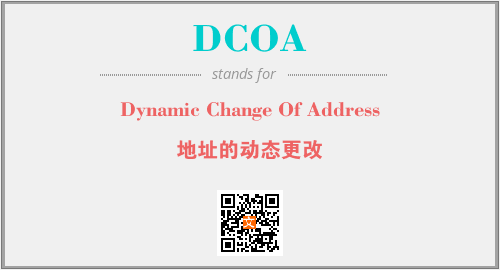 上述内容是“Dynamic Change Of Address”作为“DCOA”的缩写,解释为“地址的动态更改”时的信息,以及英文缩略词DCOA所代表的英文单词,其对应的中文拼音、详细解释以及在英文中的流行度和相关分类、应用领域及应用示例等。