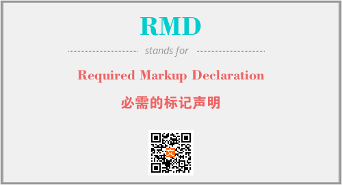 英文缩略词“RMD”经常作为“Required Markup Declaration”的英文缩写来使用,中文表示:“必需的标记声明”。本文将详细介绍英文缩写词RMD所代表英文单词,其对应的中文拼音、详细解释以及在英语中的流行度。此外,还有关于缩略词RMD的分类、应用领域及相关应用示例等。