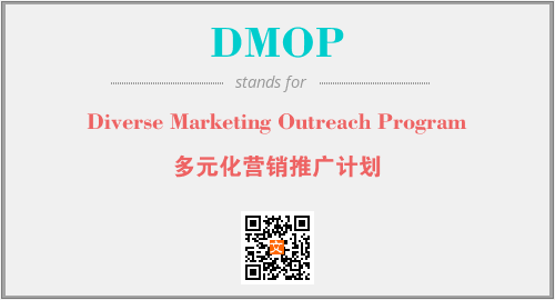 上述内容是“Diverse Marketing Outreach Program”作为“DMOP”的缩写,解释为“多元化营销推广计划”时的信息,以及英文缩略词DMOP所代表的英文单词,其对应的中文拼音、详细解释以及在英文中的流行度和相关分类、应用领域及应用示例等。