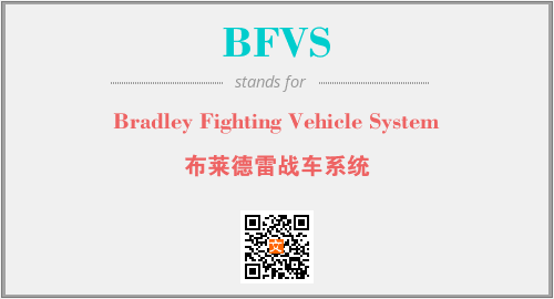 上述内容是“Bradley Fighting Vehicle System”作为“BFVS”的缩写,解释为“布莱德雷战车系统”时的信息,以及英文缩略词BFVS所代表的英文单词,其对应的中文拼音、详细解释以及在英文中的流行度和相关分类、应用领域及应用示例等。
