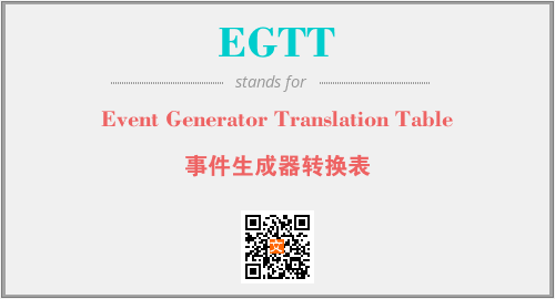 英文缩略词“EGTT”经常作为“Event Generator Translation Table”的英文缩写来使用,中文表示:“事件生成器转换表”。本文将详细介绍英文缩写词EGTT所代表英文单词,其对应的中文拼音、详细解释以及在英语中的流行度。此外,还有关于缩略词EGTT的分类、应用领域及相关应用示例等。