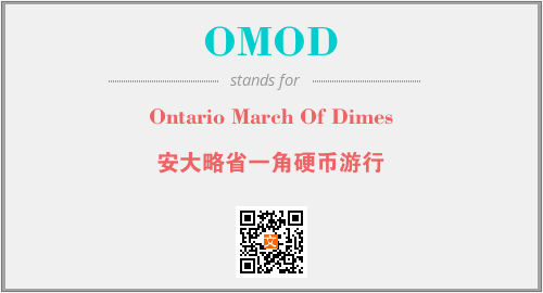 上述内容是“Ontario March Of Dimes”作为“OMOD”的缩写,解释为“安大略省一角硬币游行”时的信息,以及英文缩略词OMOD所代表的英文单词,其对应的中文拼音、详细解释以及在英文中的流行度和相关分类、应用领域及应用示例等。