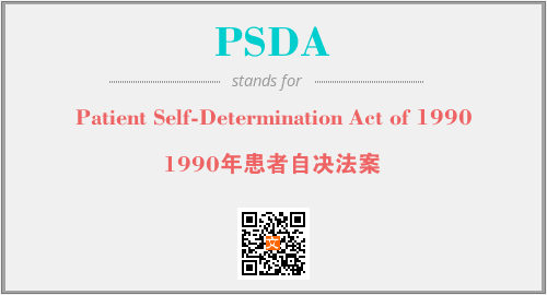 上述内容是“Patient Self-Determination Act of 1990”作为“PSDA”的缩写,解释为“1990年患者自决法案”时的信息,以及英文缩略词PSDA所代表的英文单词,其对应的中文拼音、详细解释以及在英文中的流行度和相关分类、应用领域及应用示例等。