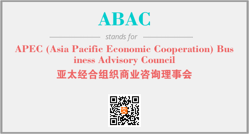 英文缩略词“ABAC”经常作为“APEC (Asia Pacific Economic Cooperation) Business Advisory Council”的英文缩写来使用,中文表示:“亚太经合组织商业咨询理事会”。本文将详细介绍英文缩写词ABAC所代表英文单词,其对应的中文拼音、详细解释以及在英语中的流行度。此外,还有关于缩略词ABAC的分类、应用领域及相关应用示例等。