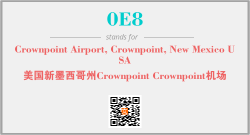 上述内容是“Crownpoint Airport, Crownpoint, New Mexico USA”作为“0E8”的缩写,解释为“美国新墨西哥州Crownpoint Crownpoint机场”时的信息,以及英文缩略词0E8所代表的英文单词,其对应的中文拼音、详细解释以及在英文中的流行度和相关分类、应用领域及应用示例等。