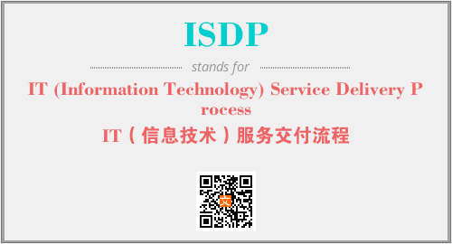 英文缩略词“ISDP”经常作为“IT (Information Technology) Service Delivery Process”的英文缩写来使用,中文表示:“IT(信息技术)服务交付流程”。本文将详细介绍英文缩写词ISDP所代表英文单词,其对应的中文拼音、详细解释以及在英语中的流行度。此外,还有关于缩略词ISDP的分类、应用领域及相关应用示例等。
