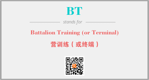 上述内容是“Battalion Training (or Terminal)”作为“BT”的缩写,解释为“营训练(或终端)”时的信息,以及英文缩略词BT所代表的英文单词,其对应的中文拼音、详细解释以及在英文中的流行度和相关分类、应用领域及应用示例等。