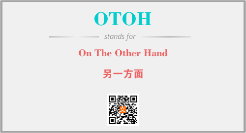 以上为On The Other Hand英文缩略词OTOH的中文解释,以及该英文缩写在英语的流行度、分类和应用领域方面的信息。